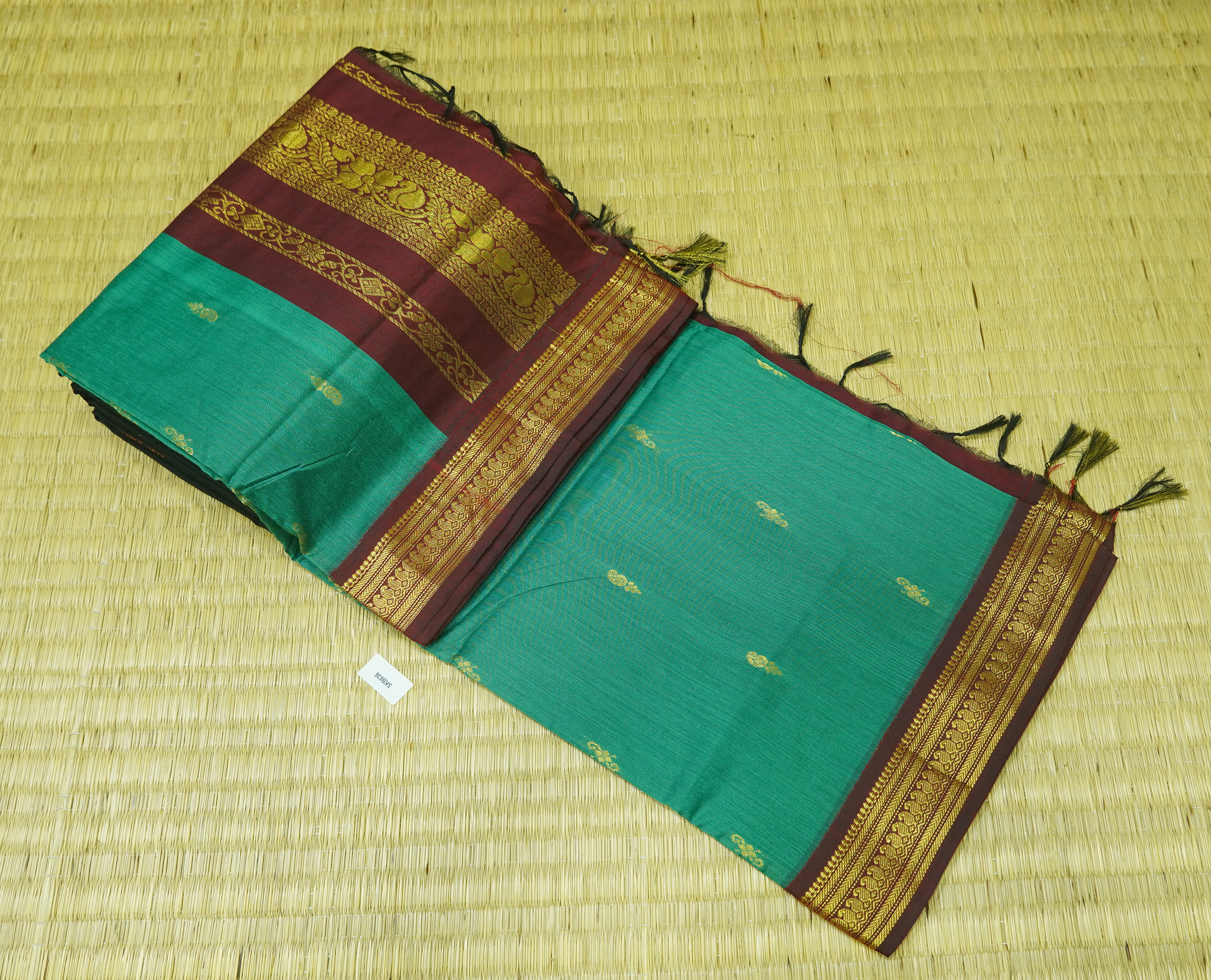Kalyani Cotton Saree is Purely a Traditional Saree. Saree will Have Zari Buttas all over the Body. Saree Comes with Contrast Pallu & Blouse.
