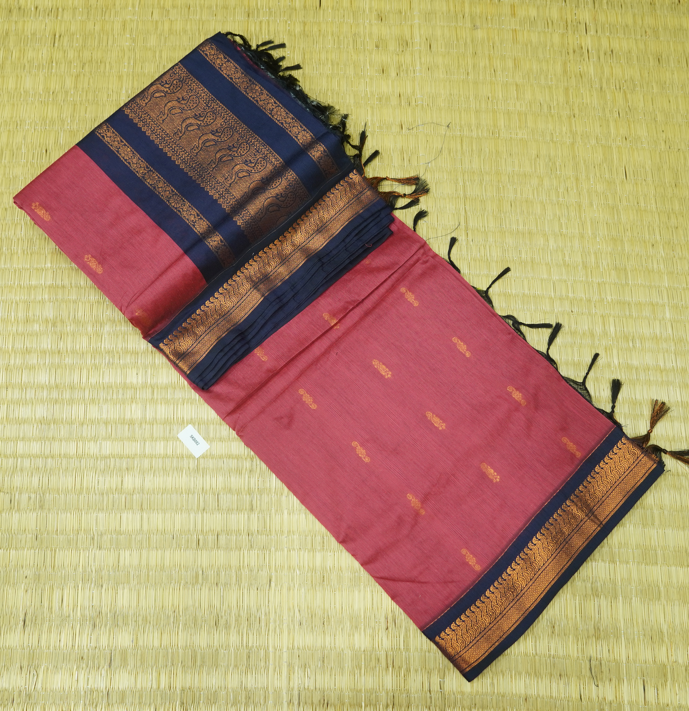 Kalyani Cotton Saree is Purely a Traditional Saree. Saree will Have Zari Buttas all over the Body. Saree Comes with Contrast Pallu & Blouse.