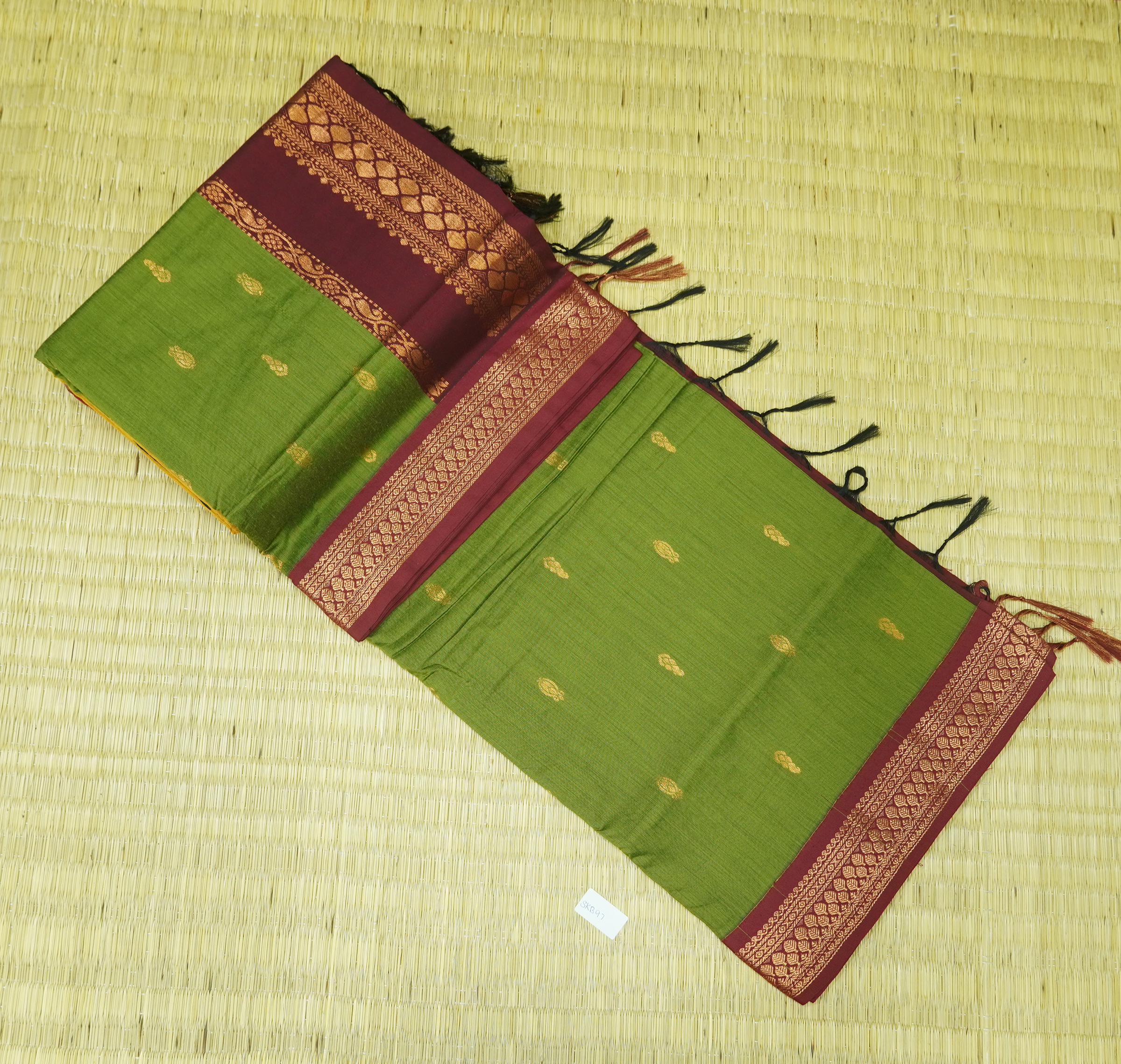 Kalyani Cotton Saree is Purely a Traditional Saree. Saree will Have Zari Buttas all over the Body. Saree Comes with Contrast Pallu & Blouse.