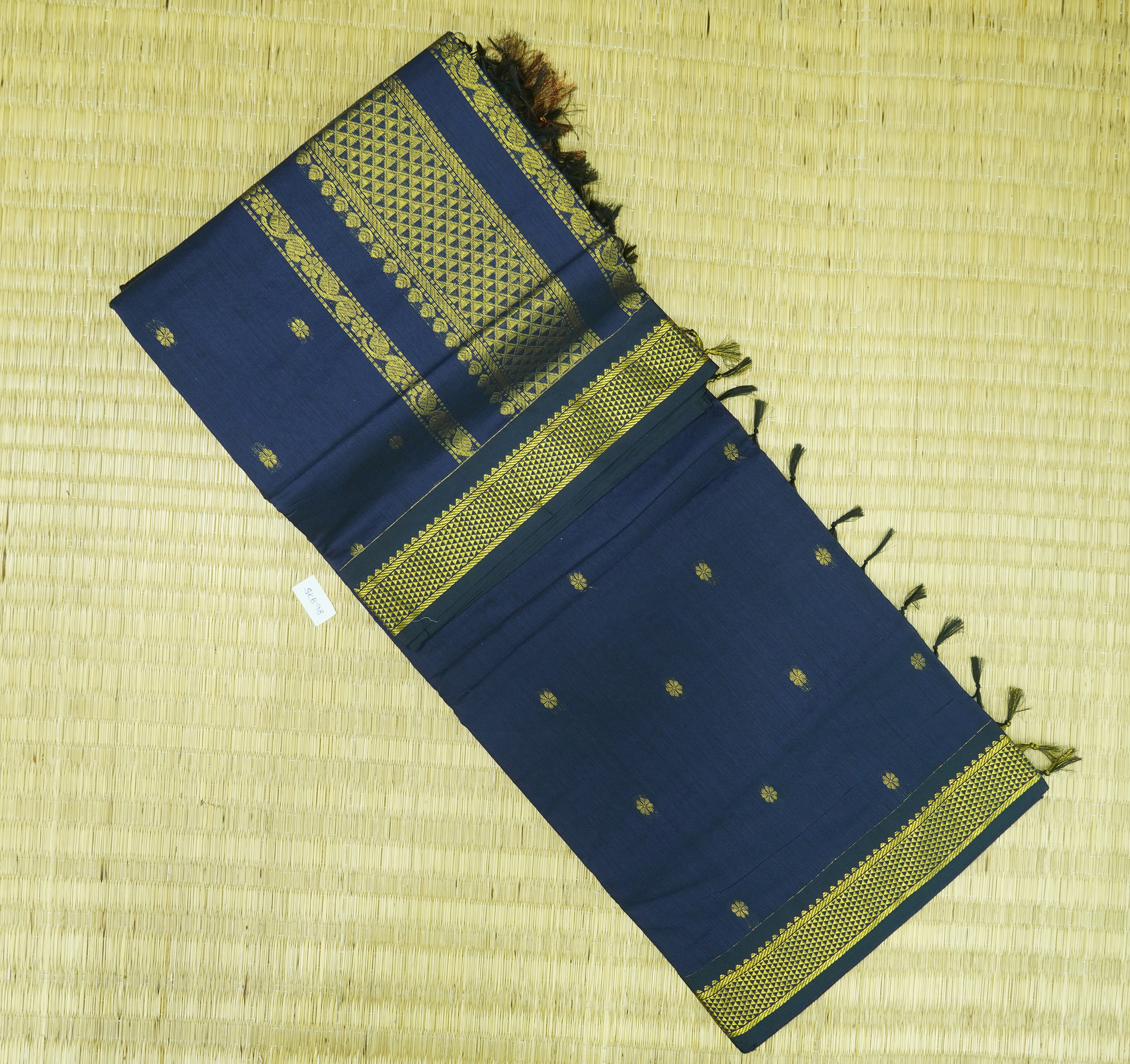 Kalyani Cotton Saree is Purely a Traditional Saree. Saree will Have Zari Buttas all over the Body. Saree Comes with Contrast Pallu & Blouse.