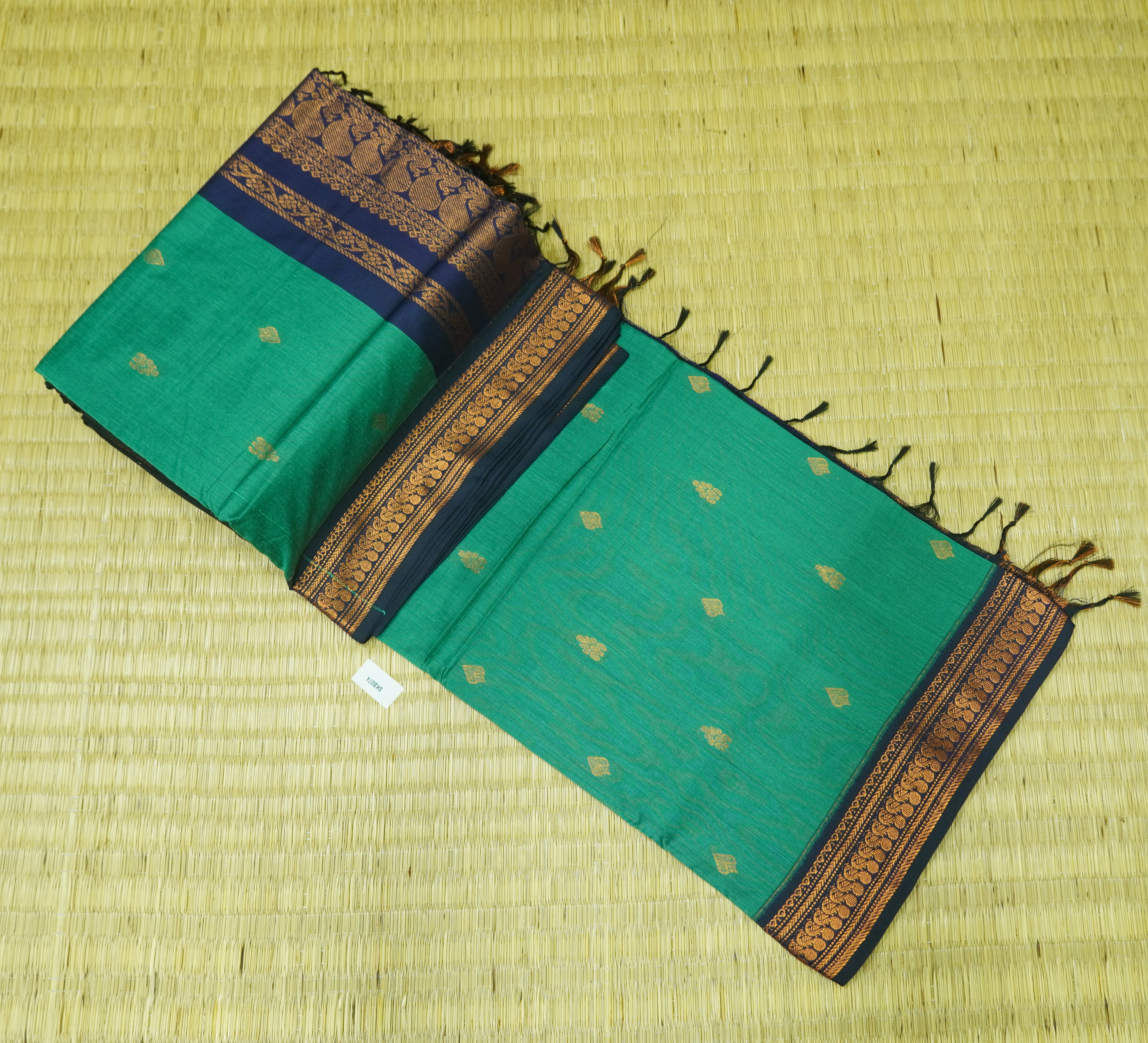 Kalyani Cotton Saree is Purely a Traditional Saree. Saree will Have Zari Buttas all over the Body. Saree Comes with Contrast Pallu & Blouse.