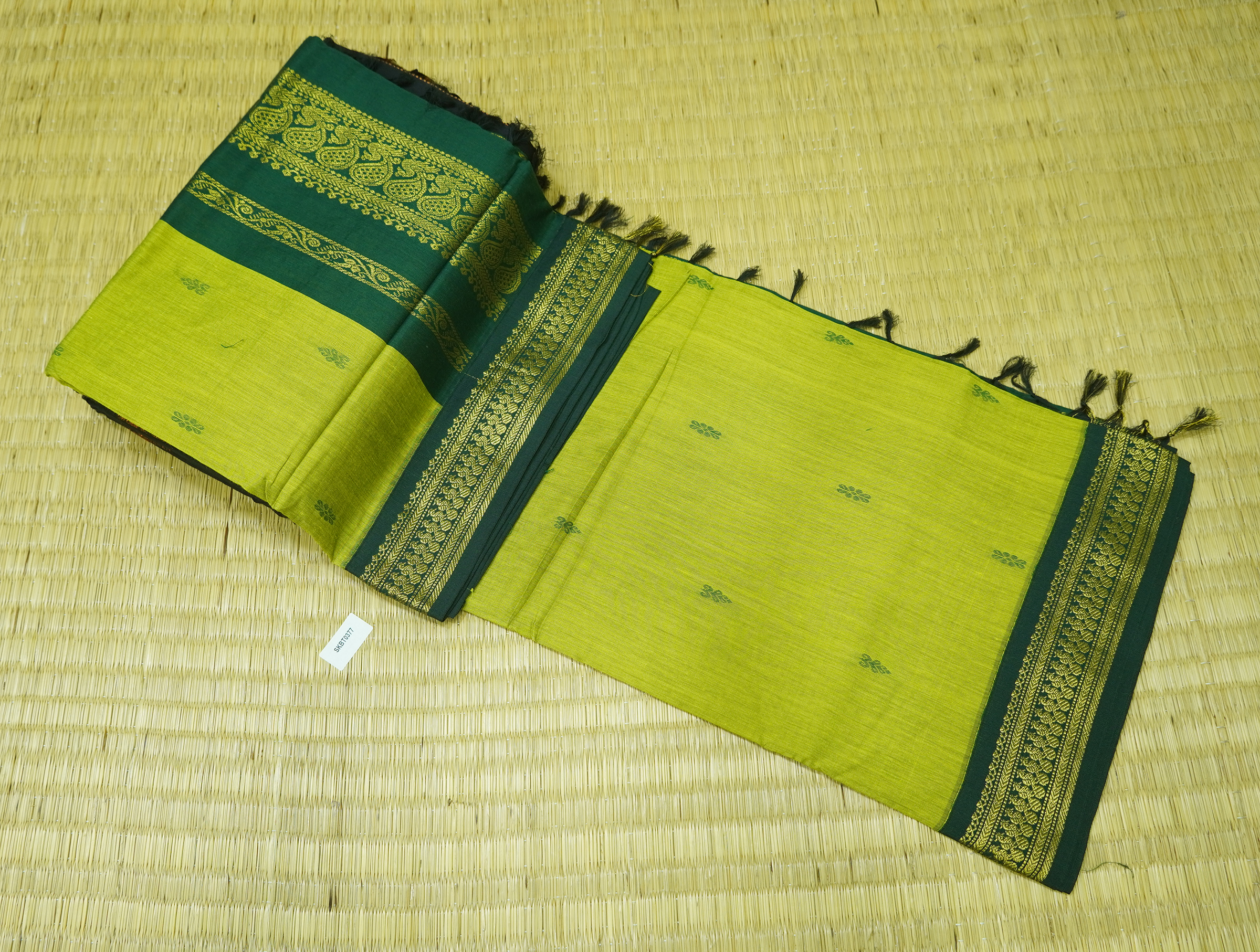 Kalyani Cotton Saree is Purely a Traditional Saree. Saree will Have Thread Buttas all over the Body. Saree Comes with Contrast Pallu & Blouse.