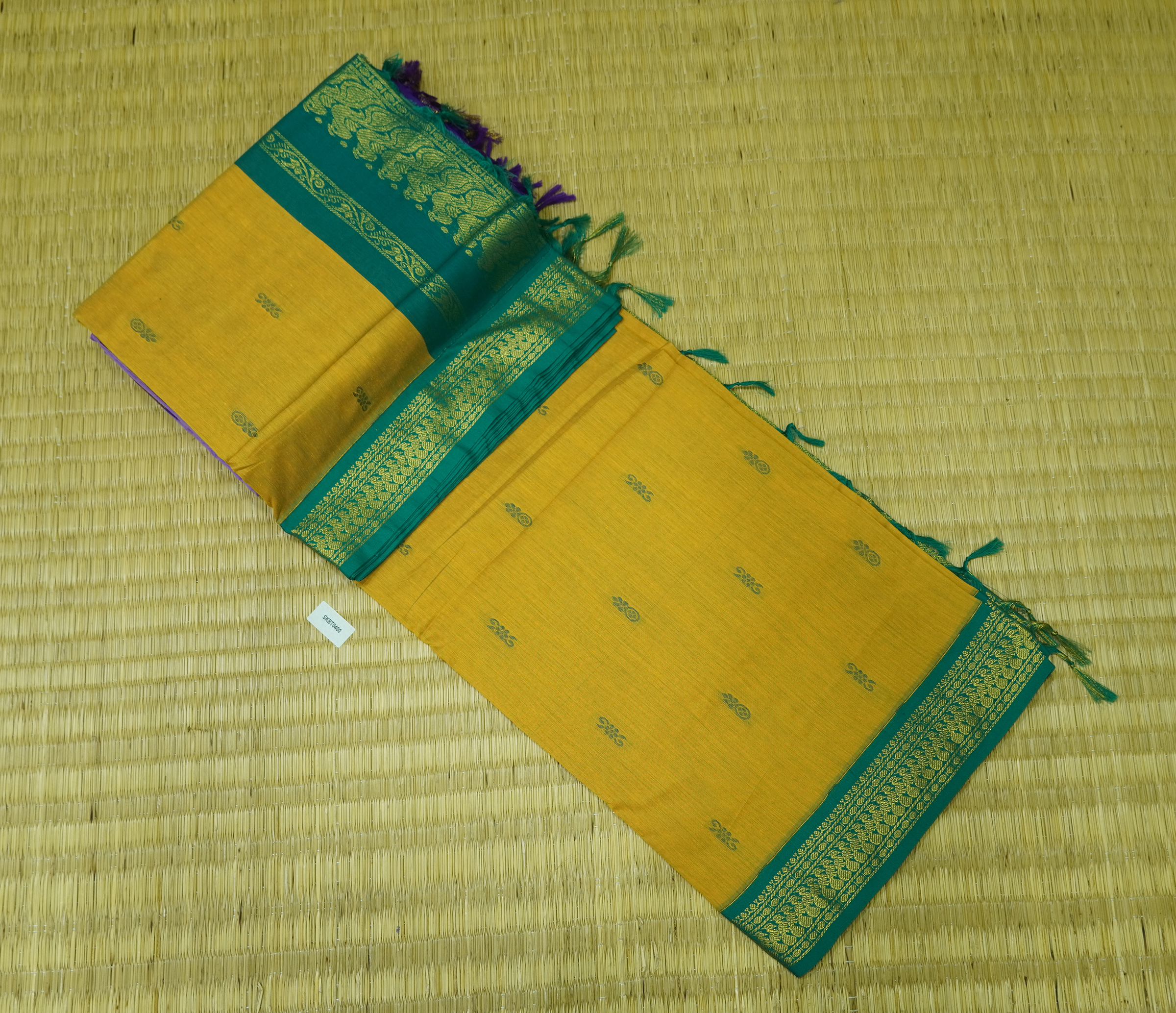 Kalyani Cotton Saree is Purely a Traditional Saree. Saree will Have Thread Buttas all over the Body. Saree Comes with Contrast Pallu & Blouse.