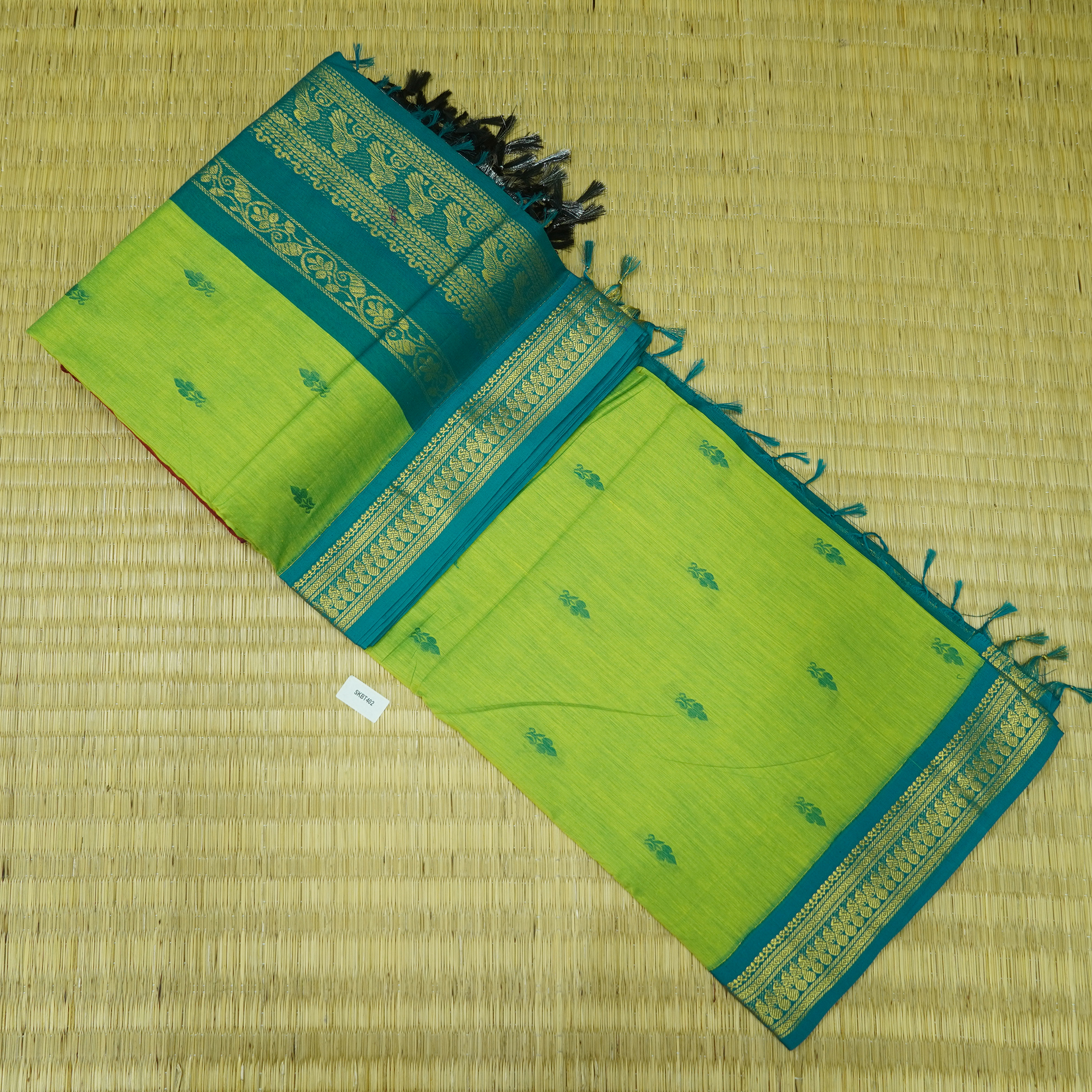 Kalyani Cotton Saree is Purely a Traditional Saree. Saree will Have Thread Buttas all over the Body. Saree Comes with Contrast Pallu & Blouse.